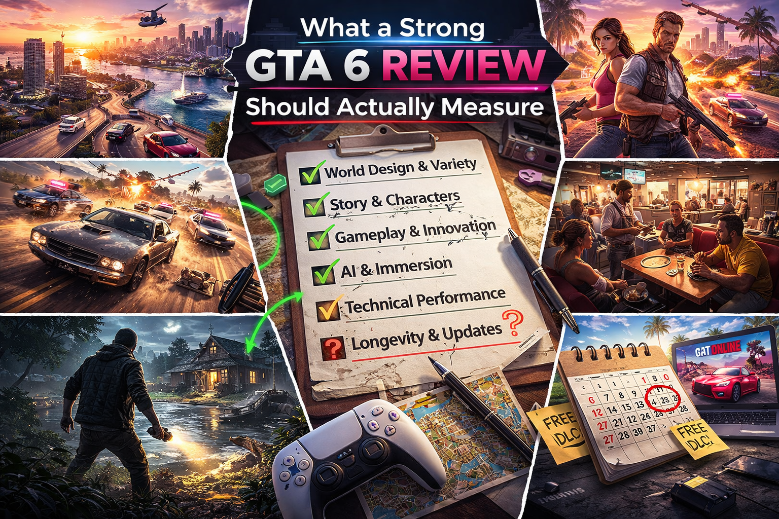 Quando Grand Theft Auto 6 chegar, muitas resenhas naturalmente se concentrarão no tamanho, nos valores de produção e no polimento técnico. Essas são considerações importantes, mas não são suficientes. Uma análise significativa de um jogo da Rockstar deve medir mais do que o espetáculo. Deve perguntar o que o jogo está a tentar dizer, com que eficácia os seus sistemas suportam essa ambição e se o seu mundo aberto faz mais do que simplesmente existir numa escala impressionante.
